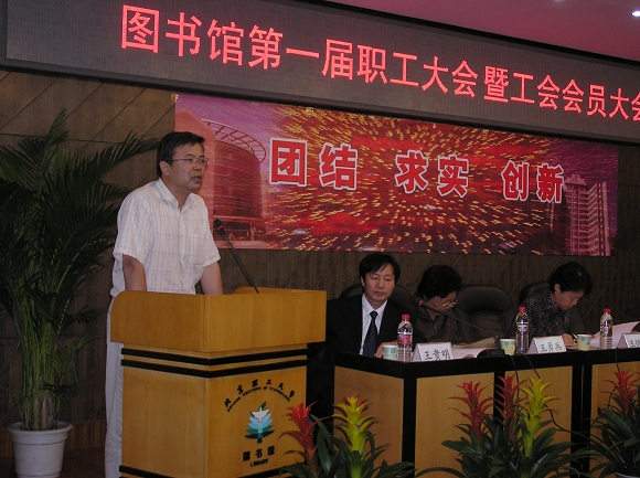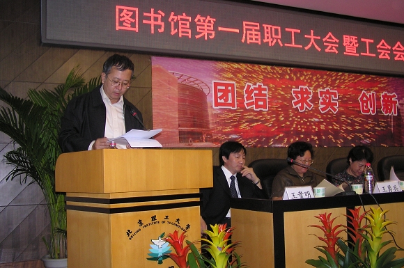 這次職工大會暨工會會員大會是在“十一五”的開局年、“985工程”建設和迎接本科教學評估走好第一步的關鍵時刻召開的一次重要會議。它既是一個團結、民主、集思廣義的群英會,也是一個振奮精神、創造北京理工大學圖書館輝煌的誓師會。它必將在北京理工大學圖書館的發展史上產生重大而深遠的影響。各位代表都決心以這次大會為契機,高舉鄧小平理論偉大旗幟,落實“三個代表”、科學發展觀的重要思想,抓住機遇,在學校黨委和行政的領導下,團結、求實、創新,搞好圖書館的各項工作,為提升我校總體教學、科研水平做出自己的貢獻。團結起來,為建設國內一流的高校圖書館而努力奮斗!