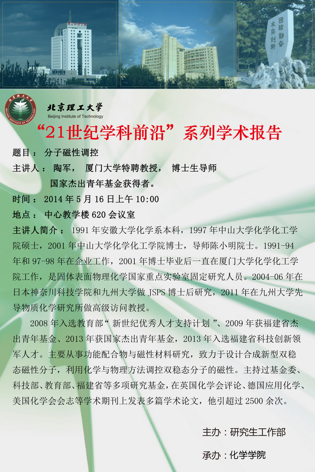 化學(xué)學(xué)院“21世紀(jì)學(xué)科前沿”陶軍教授學(xué)術(shù)報告預(yù)告