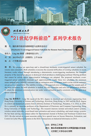 施凌教授于2002年獲得香港科技大學理學學士學位,2008年獲得美國加州理工學院哲學博士學位。現任香港科技大學電子與計算機工程系副教授。施凌教授的研究方向主要包括網絡化控制系統,無線傳感器網絡,事件驅動狀態估計與傳感器調度,智能能源系統等,在控制與信號處理領域頂級國際刊物Automatica, IEEE Transactions on Automatic Control, IEEE Transactions on Signal Processing, Systems & Control Letters上發表論文40余篇。現擔任控制領域國際期刊International Journal of Robust and Nonlinear Control編委,并擔任IEEE Transactions on Industrial Informatics特刊Secure Detection, Estimation, and Control in Cyber-Physical Systems客座編輯。