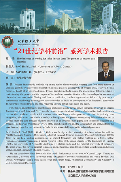 Sirish L. Shah現任加拿大阿爾伯塔大學教授,加拿大工程院院士,加拿大化學院院士,曾任加拿大自然科學與工程研究委員會計算機過程控制領域的NSERC-Matrikon-Suncor-iCORE工業研究首席教授(Senior Industrial Research Chair),并在牛津大學貝利奧爾學院(SERC學者),日本熊本大學(日本學術振興會高級研究學者),澳大利亞紐卡斯爾大學,印度理工學院馬德拉斯分校,新加坡國立大學等國外知名高校擔任訪問教授。Shah教授的主要研究領域為控制性能評估、系統辨識、軟測量、報警監控等,是過程控制領域的著名專家,享有很高的國際聲譽。