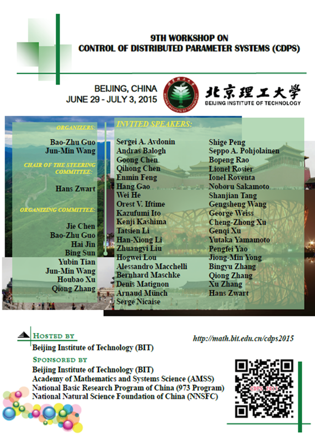 “2015分布參數系統控制國際研討會”將于2015年6月29日至2015年7月3日在北京理工大學召開。此次研討會由北京理工大學主辦,北京理工大學數學與統計學院和中國科學院數學與系統科學研究院聯合舉辦。