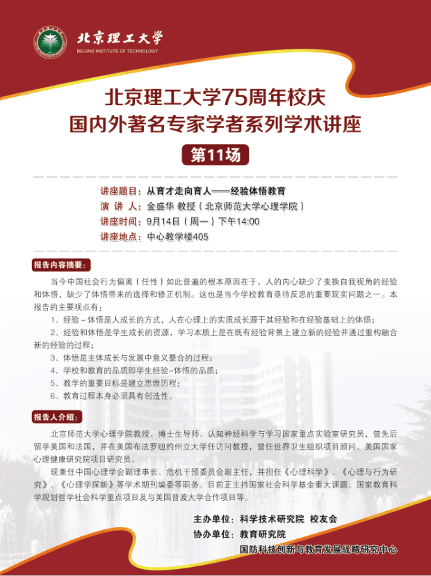 北京理工大學(xué)75周年校慶國(guó)內(nèi)外著名專家系列講座第十一期預(yù)告:金盛華教授談從育才走向育人——經(jīng)驗(yàn)體悟教育