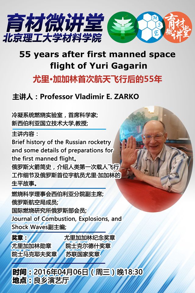 【材料學院】“育材微講堂”第十四期預告—俄羅斯Vladimir E.ZARKO教授講述尤里·加加林首次航天飛行后的55年