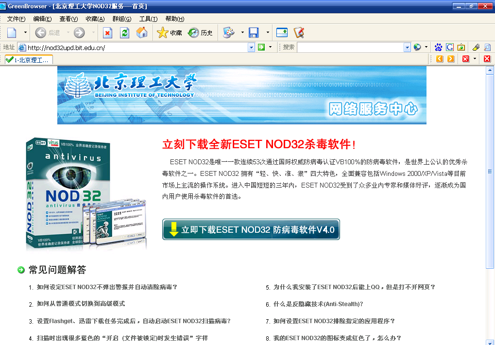 在校內任何一臺可以訪問校園網的機器上,打開機器的IE瀏覽器,輸入網址:http://nod32upd.bit.edu.cn。