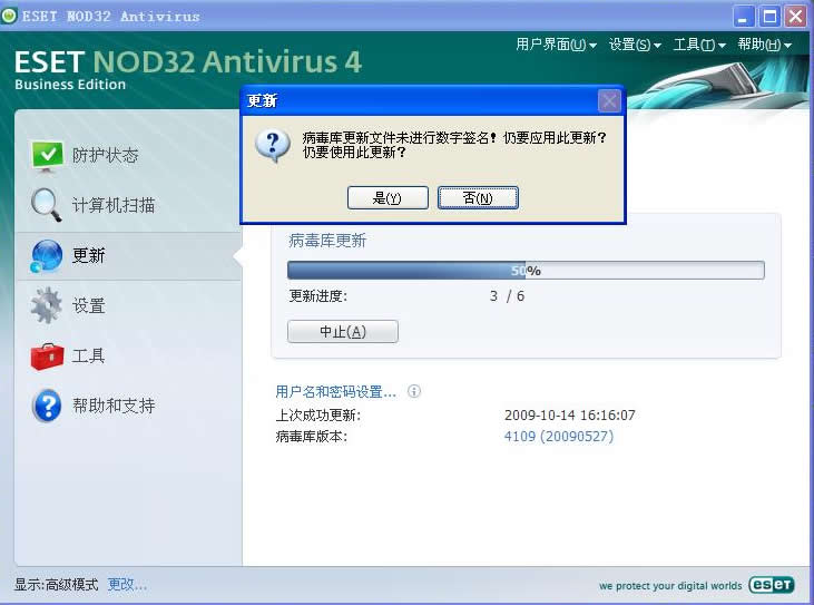 安裝完成之后的第一次病毒庫更新,需要用戶手工進行。雙擊NOD32圖標,在打開的窗口中,點擊“更新”,選擇“更新病毒庫”鏈接。病毒庫更新過程中,可能出現如“病毒庫更新文件沒有數字簽名”之類的提示,點擊“是”按鈕,繼續進行升級即可。