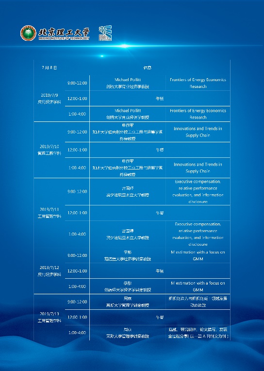 7月4日至13日,北京理工大學(xué)管理與經(jīng)濟(jì)學(xué)院2019暑期班在主樓如期舉行。作為學(xué)院年度學(xué)術(shù)盛宴,華盛頓大學(xué)信息和運(yùn)營(yíng)管理系講席教授譚勇、波士頓學(xué)院經(jīng)濟(jì)學(xué)教授肖志杰、香港城市大學(xué)營(yíng)銷系教授李娟、香港大學(xué)戰(zhàn)略及國(guó)際商務(wù)系教授周政、劍橋大學(xué)商業(yè)經(jīng)濟(jì)學(xué)教授Michael Pollitt、加州大學(xué)伯克利分校工業(yè)工程與運(yùn)籌學(xué)系教授申作軍、賓夕法尼亞州立大學(xué)會(huì)計(jì)系教授宮國(guó)瑾、范德堡大學(xué)經(jīng)濟(jì)學(xué)講席教授李彤、萊斯大學(xué)管理學(xué)講席教授周京9位國(guó)際頂級(jí)學(xué)術(shù)大師帶來(lái)國(guó)際前沿的學(xué)術(shù)分享,200余位管理與經(jīng)濟(jì)學(xué)院教師、碩博研究生參與報(bào)告,大咖云集、熠熠生輝。