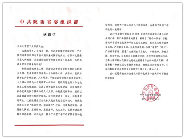 “大地回春早,山河又一新。值此新春佳節來臨之際,中共陜西省委組織部對貴校長期以來對陜西的關注、信任和支持表示衷心的感謝,并...
